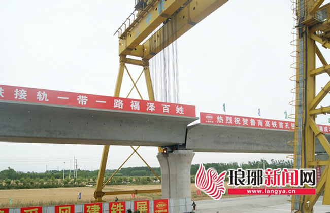 6月5日,随着大型架桥机的缓缓前行,重达900吨的预应力混凝土箱梁稳稳落在临沂北特大桥223号和224号桥墩上,宣告鲁南高铁临沂至曲阜段首孔箱梁架设成功,这是在项目开工5个半月时间内实现的,比国内其他铁路项目11个月架梁的平均工期缩短一半,鲁南高铁再次刷新了全国高铁建设纪录。
