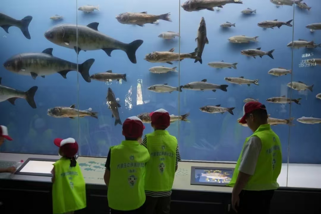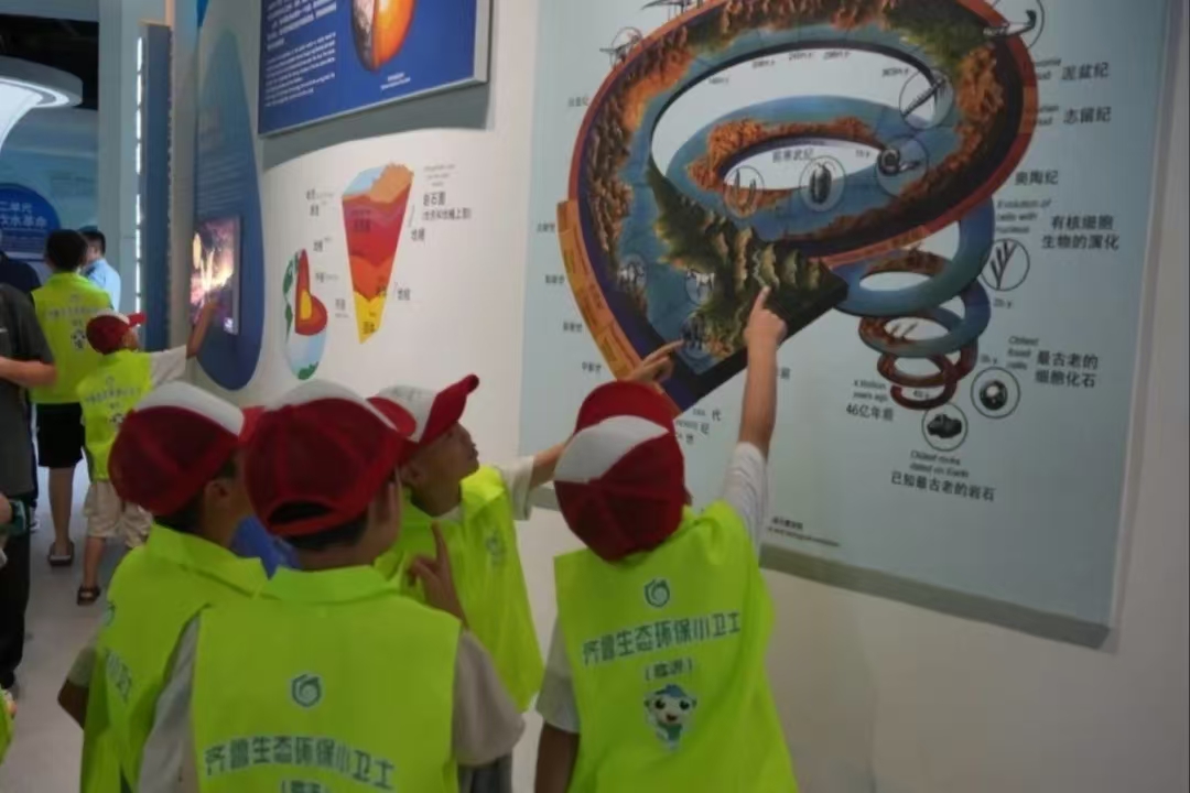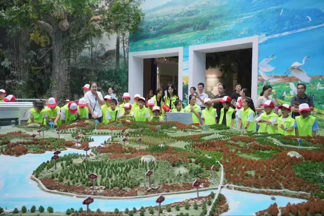 随后,在工作人员的带领下,环保小卫士前往云蒙明珠展览馆进行参观,馆内通过文字、图片、影像等多种形式,全面展示了云蒙湖的历史变迁、生态环境以及保护措施。在“绿色情怀”与“蓝色畅想”展区,小卫士们不仅领略了云蒙湖湿地的独特魅力,还深入了解了蒙阴县的人文历史、地理位置以及云蒙湖生态环境的演变过程。通过湿地展示沙盘及各类影像资料,让他们对水资源的珍贵与保护的重要性有了更加直观的认识。在“红色记忆”与VR科技体验区,小卫士们穿越时空,感受了修建云蒙湖时的沂蒙革命精神,深刻体会到了生态环保背后所承载的历史使命和民族情怀。同时,现代化的VR科技也为他们带来了前所未有的沉浸式体验,让他们在虚拟与现实的交织中,更加深刻地理解了生态环保的丰富内涵和紧迫性。