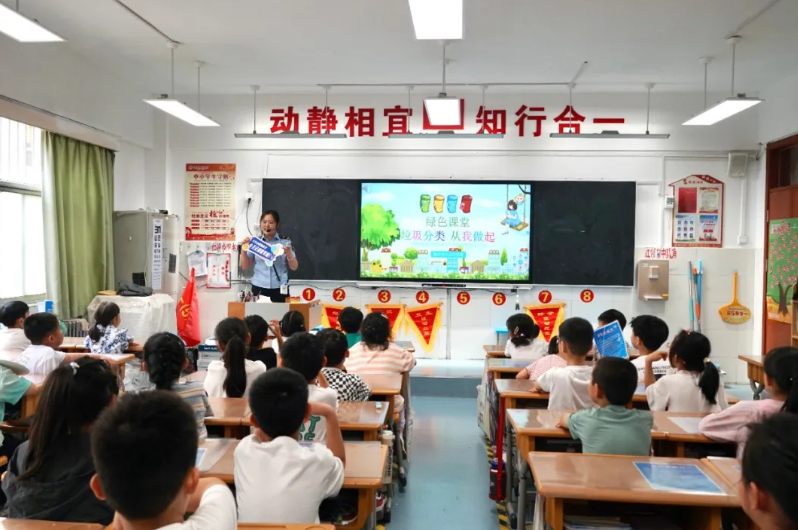 互动问答环节将课堂气氛推向了高潮。“废旧温度计属于什么垃圾?”“过期药品该怎么处理?”随着问题接连抛出,教室里齐刷刷举起一片“小手森林”。孩子们认真思考、积极抢答的模样,俨然是一个个环保小专家。课程结束后,市生态环境局的工作人员为孩子们发放了精心准备的环保笔筒、彩笔等文具。