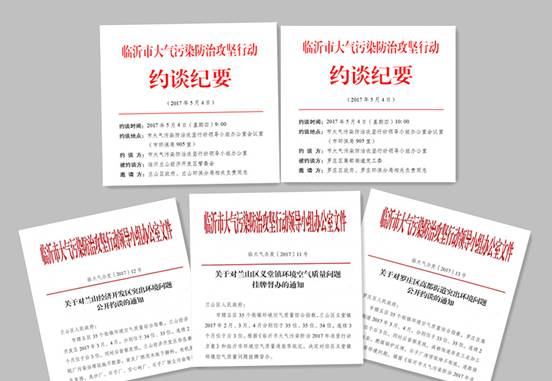 5月4日上午,因治污不力,临沂市兰山经济开发区管委会党工委书记王玉杰、罗庄区高都街道党工委书记张浩、在临沂市环保局接受公开约谈。兰山区义堂镇因空气质量连续3个月位于后3位,被挂牌督办。