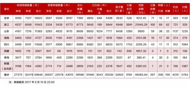 截至2017年9月15日,督察组交办的环境举报,地方已办结35039件,办结率达到88.5%。其中,责令整改32602家;立案处罚9181家,罚款46583.84万元;立案侦查297件,行政和刑事拘留364人;约谈4210人,问责5763人(具体情况详见附表)。