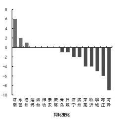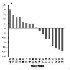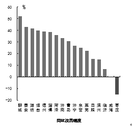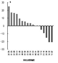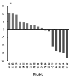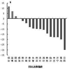 四、可吸入粒物(PM10) 可吸入颗粒物浓度最好的城市是威海市,为40μg/m3,最差的城市是菏泽市,为113μg/m3。9市同比改善,改善幅度最大的城市是威海市,为20.0%;8市同比恶化,恶化幅度最大的城市是菏泽市,为24.2%。