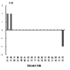 二、重污染天数(AQI﹥200) 重污染天数最少的为济南等16市,未出现重污染天气;最多的为菏泽市,为1天。枣庄和德州市同比减少最多,为1天;济南等14市同比持平;增加最多的是菏泽市,为1天。