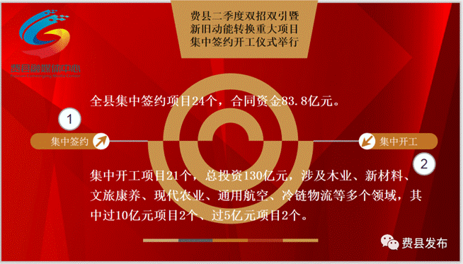 5月22日,费县举行二季度双招双引暨新旧动能转换重大项目集中签约开工仪式,主会场设在胡阳镇,县经济开发区、费城街道、大田庄乡等11个乡镇(街道、开发区)设立分会场。
