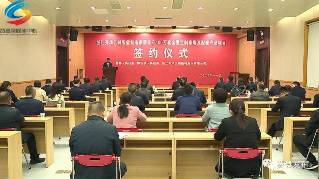 11月18日,浙江升华云峰智能制造家居年产100万套全屋定制家居及配套产品项目签约仪式举行,费县政协主席张效玺,副县长朱玉祥、谭成亮,浙江升华云峰新材料股份有限公司董事长顾水祥出席签约仪式。