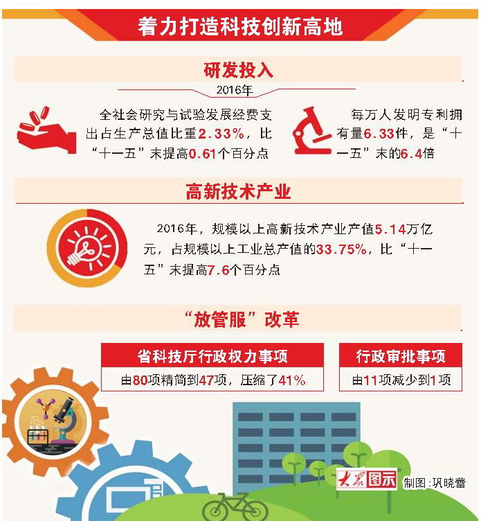 动能转换,创新先行。2016年,全省全社会研究与试验发展(R&D)经费支出占生产总值的比重达到2.33%,比“十一五”末提高0.61个百分点。每万人发明专利拥有量分别达到6.33件,是“十一五”末的6.4倍。登记技术合同2.23万项,成交额420.24亿元,是“十一五”末的4.2倍。规模以上高新技术产业实现产值5.14万亿元,占规模以上工业总产值的比重达到33.75%,比“十一五”末提高7.6个百分点。区域创新综合能力连续六年保持在全国第六位。