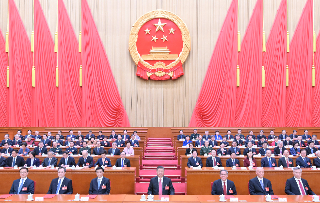3月11日,第十四届全国人民代表大会第二次会议在北京人民大会堂闭幕。党和国家领导人习近平、李强、王沪宁、蔡奇、丁薛祥、李希、韩正等在主席台就座。 (新华社记者 谢环驰 摄)