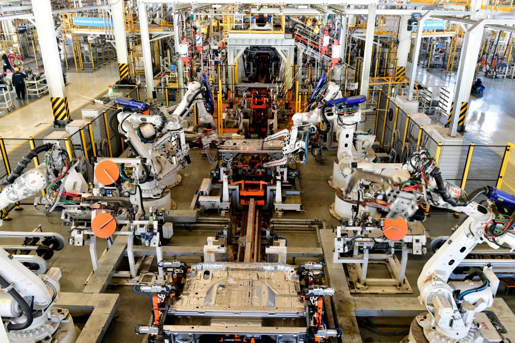 1月9日,在位于日照市五莲县的五征集团汽车焊装车间,工业机器人在焊装车身。新华社记者郭绪雷摄