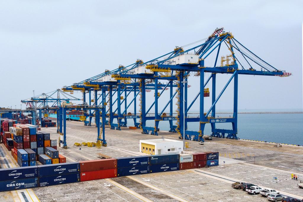 这是2月21日在喀麦隆南部大区的克里比拍摄的喀麦隆克里比深水港二期照片(无人机照片)。由中国港湾工程有限责任公司(中国港湾)承建的喀麦隆克里比深水港二期工程交工仪式21日在克里比深水港码头举行。新华社发(科普索摄)