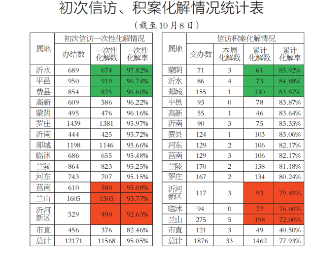 共交办积案1876件,期间化解33件,累计化解1462件,化解率77.93%。较高的县区有:蒙阴、沂水、郯城,较低的有:兰山、临沭、沂河新区。市直部门单位本周新增化解案件3件(其中,市自规局1件、市国资委1件、市烟草公司1件),累计化解49件,化解率40.50%。