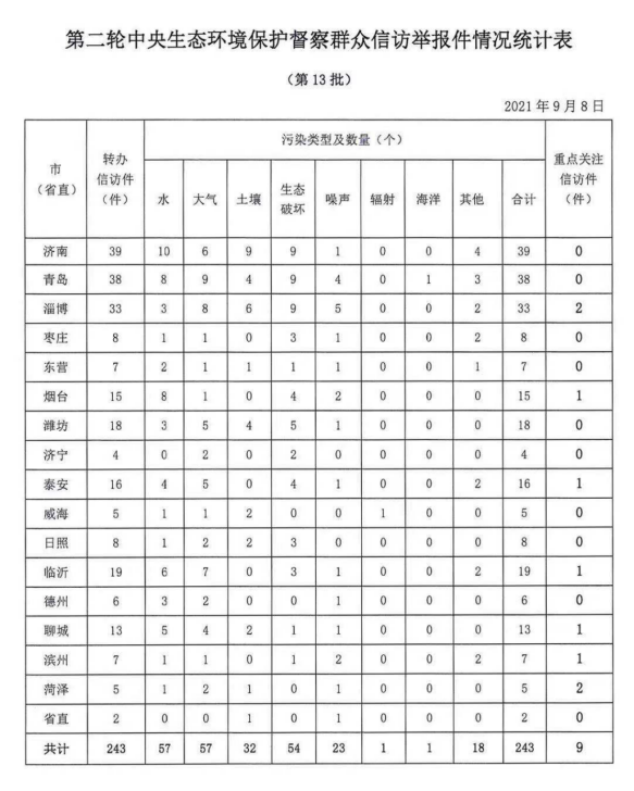 9月8日,中央第二生态环境保护督察组向我省转办信访件243件(重点关注件9件),其中来电66件,来信177件。本批信访件涉及济南市39件、青岛市38件、淄博市33件、枣庄市8件、东营市7件、烟台市15件、潍坊市18件、济宁市4件、泰安市16件、威海市5件、日照市8件、临沂市19件、德州市6件、聊城市13件、滨州市7件、菏泽市5件、省直部门2件。共涉及环境问题 243个,其中大气污染问题57个、水污染问题57个、生态破坏问题54个、土壤污染问题32个、噪声污染问题23个、辐射污染问题1个、海洋污染问题1个、其他问题18个。当日,上述信访件全部交办各市和省直部门。按照中央第二生态环境保护督察组的要求,信访举报件的办理情况须在10天内反馈到督察组,整改和处理情况将及时向社会公开。