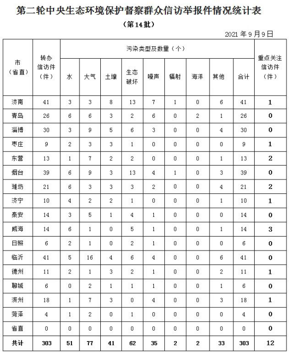 9月9日,中央第二生态环境保护督察组向我省转办信访件303件(重点关注件12件),其中来电69件,来信234件。本批信访件涉及济南市41件、青岛市26件、淄博市30件、枣庄市9件、东营市13件、烟台市39件、潍坊市21件、济宁市10件、泰安市14件、威海市14件、日照市6件、临沂市41件、德州市11件、聊城市6件、滨州市18件、菏泽市4件。共涉及环境问题 303个,其中大气污染问题77个、水污染问题51个、生态破坏问题62个、土壤污染问题41个、噪声污染问题35个、辐射污染问题2个、海洋污染问题2个、其他问题33个。当日,上述信访件全部交办各市。按照中央第二生态环境保护督察组的要求,信访举报件的办理情况须在10天内反馈到督察组,整改和处理情况将及时向社会公开。