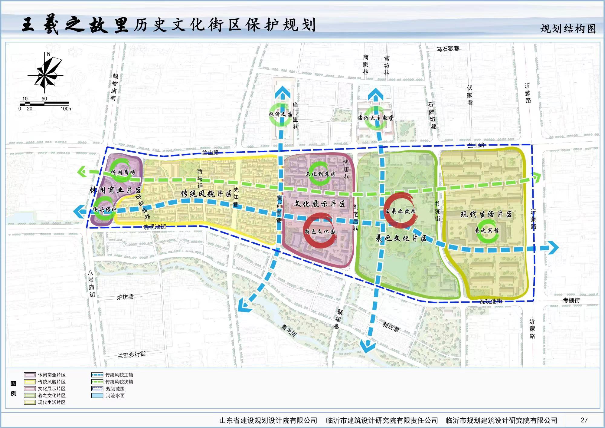 七、保护区划划定 王羲之故里历史文化街区的保护范围,东至沂蒙路,南至洗砚池街,西至蚂蚱庙街,北至兰山路,包括核心保护范围和建设控制地带,总用地面积21.1公顷。 1、核心保护范围的划定 王羲之故居和皮鞋厂,用地面积共5.6公顷。具体范围以保护区划图所划定的范围为准。 2、建设控制地带的划定 东至沂蒙路,南至洗砚池街,西至蚂蚱庙街,北至兰山路。用地面积15.5公顷。(不包括核心保护范围)。具体范围以保护区划图所划定的范围为准。 八、展示利用规划 展示规划结构 通过文物建筑、文化创意园、重点街巷、特色商业街、王羲之故居等节点展示王羲之故里历史文化保护街区,形成“点—线—面”结合的展示体系。 “点”—休闲商场:综合性的购物休闲中心;街头绿地:雕塑、浮雕、景观小品等;文化创意园:独特的艺术文化交流地;特色文化街:保持原有建筑风貌,开发特色商业活动;王羲之故居:王羲之及琅琊王氏文化展示;羲之宾馆:餐饮住宿。 “线”—重点景观横轴;重点景观竖轴。 “面”—休闲商业片区;传统风貌片区;文化展示片区;羲之文化片区、现代生活片区;