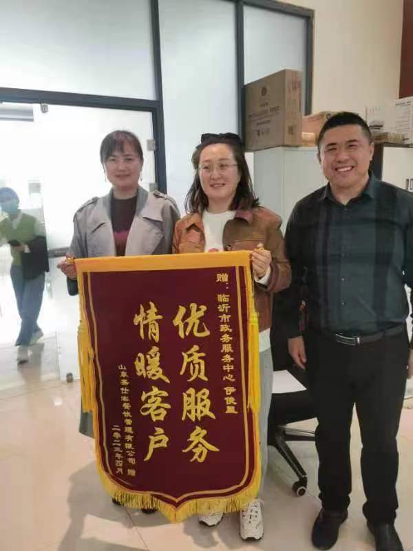 2023年4月10日,山东嘉仕客餐饮管理有限公司的刘女士将一面印有“优质服务,情暖客户”的锦旗送到了我局驻政务服务中心窗口,并对窗口工作人员伊俊星热情周到的服务表示感谢。