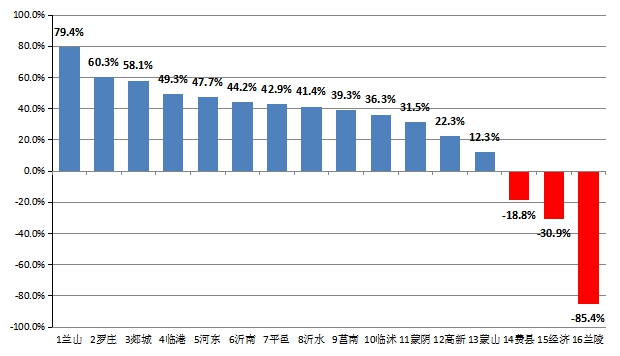 13个县区改善,兰山区改善幅度最大,为79.4%;3个县区恶化,兰陵县恶化幅度最大,为-85.4%。