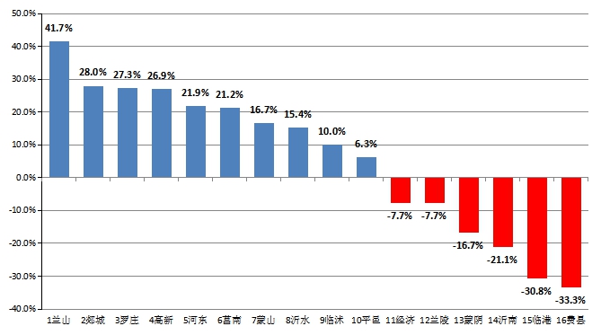 10个县区改善,兰山区改善幅度最大,为41.7%;6个县区恶化,费县恶化幅度最大,为-33.3%。