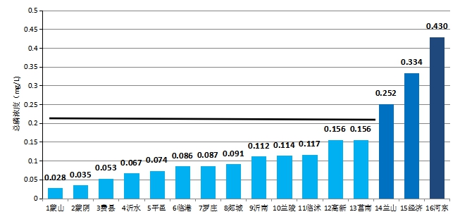 最好的是蒙阴县(0.139mg/L),最差的是河东区(2.88mg/L)。