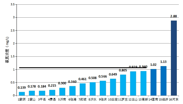 最好的是蒙山区(0.028mg/L),最差的是河东区(0.430mg/L)。