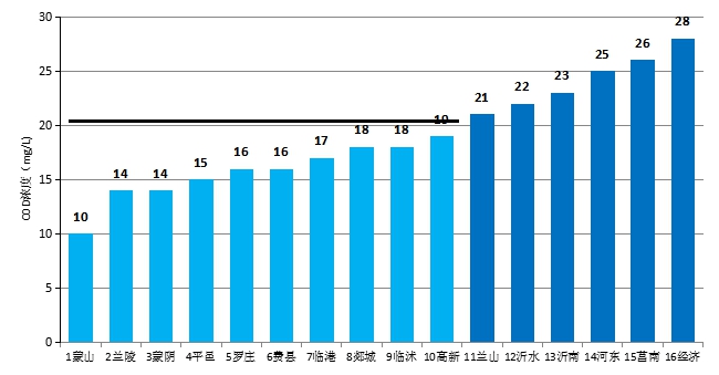 最好的是蒙山区(10mg/L),最差的是经济区(28mg/L)。
