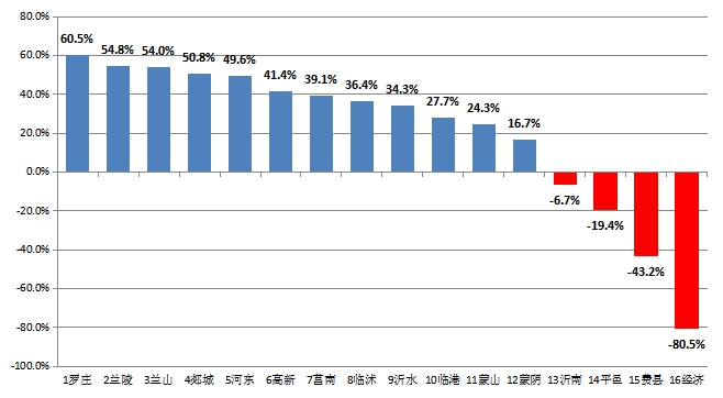 12个县区改善,罗庄区改善幅度最大,为60.5%;4个县区恶化,经济区恶化幅度最大,为-80.5%。