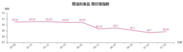 本周,粮油和食品类周价格指数报收于88.85点,环比上涨0.15点。指数二级子类中涨跌互现,粮油类、糕点类周价格指数分别上涨0.19、0.05点,茶叶类、水产制品类、干果类周价格指数分别下跌0.52、0.15、0.02点。