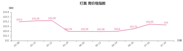 本周,灯具类周价格指数报收于103.00点,环比下跌0.05点。二级子类中涨跌互现,商业照明类周价格指数报收于129.51点,环比下跌0.28点;家居照明类、灯具配件类分别报收于94.96点、98.37点,环比分别上涨0.04点、0.01点。