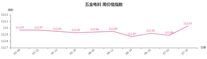 本周,五金电料类周价格指数收于113.03点,环比上涨0.14点。其中,电线电缆类、五金工具类价格指数分别上涨0.96、0.10点,五金零部件类价格指数下跌0.02点。
