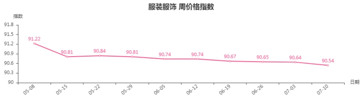 本周,服装服饰类周价格指数收于90.54点,环比下跌0.10点。从盘面看,服装类、服饰类分别下跌了0.10点、0.05点,其中三级分类特殊服装类下跌6.90点,是拉动服装服饰类下跌的主要因素。