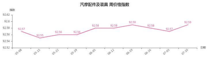 本周,汽摩配件及装具类周价格指数收于92.59点,环比上涨0.02点。其中,汽车装饰类上涨0.09点,汽车配件类、摩托车配件类均与上周持平。