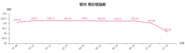 本周,板材类周价格指数收于99.16点,环比下跌0.90点。其中,石膏板类、木工板类、密度板类、多层板类、贴面板类指数分别下跌4.40、1.35、1.20、1.00和0.02点,铝塑板类指数小幅上涨0.01点。
