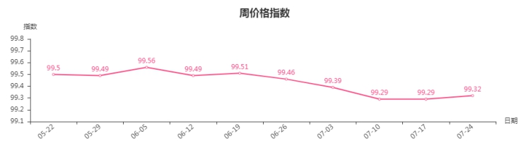 据临沂商城价格指数信息系统监测,本周(7月17日-7月24日)临沂商城周价格总指数为99.32点,环比上涨0.03点。临沂商城周价格指数跌后小幅回升,市场行情整体以稳为主。