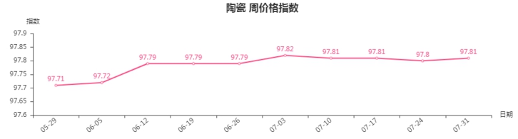 受高温天气和近期降雨增加影响,家装、工装等行业开工率降低,内外墙瓷砖、陶瓷洁具等产品市场销售量减少,价格基本保持稳定。