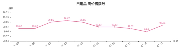 本周,日用品类周价格指数收于99.64点,环比上涨0.04点。其中,玩具类、卫生清洁用品类、厨房用品类指数环比上涨0.10、0.09、0.07点;钟表眼镜类指数下跌0.03点,其它二级子类指数较上周持平。