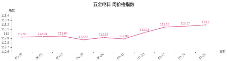 本周,五金电料类周价格指数收于113.20点,环比上涨0.03点。其中,五金零部件类、五金工具类、建筑装饰五金类价格指数分别上涨0.25、0.02、0.01点,电工电器类、焊机、焊具和焊材类、电线电缆类价格指数分别下跌0.02、0.02、0.01点。