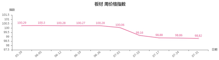 从近期指数走势来看,7月份,板材类周价格指数出现明显下跌,随着板材市场淡季深入,截止7月末,板材指数收于98.82点,持续稳中略降态势,在低位运行。