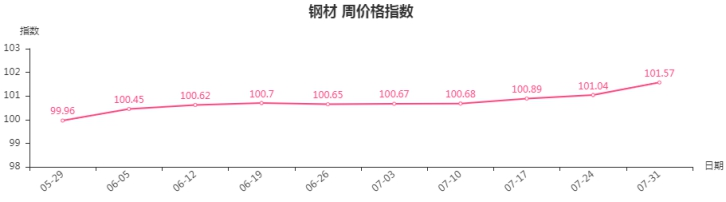 本周,钢材类周价格指数收于101.57点,环比上涨0.53点,涨幅0.52%。钢材三级分类中全部出现上涨,其中,板材类涨幅最大,指数环比上涨0.75点,型材类、建筑钢材类、管材类指数分别上涨0.57、0.39和0.27点。
