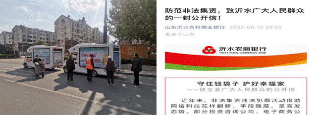 同时,沂水县各金融机构以本次集中宣传活动为契机,强化线上线下协同宣传,对重点地区、重点领域、重点人群,开展差异化、精准化宣传。据统计,此次活动共发放防非宣传公开信、打击养老诈骗宣传手册10000余份,与广大群众进行了咨询互动,4辆宣传车在乡镇、街道巡回宣传,营造了浓厚的防非处非工作氛围。
