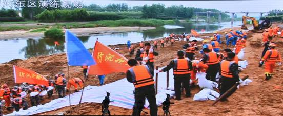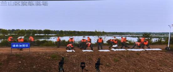 演练科目三:堤坝抢险及群众转移。