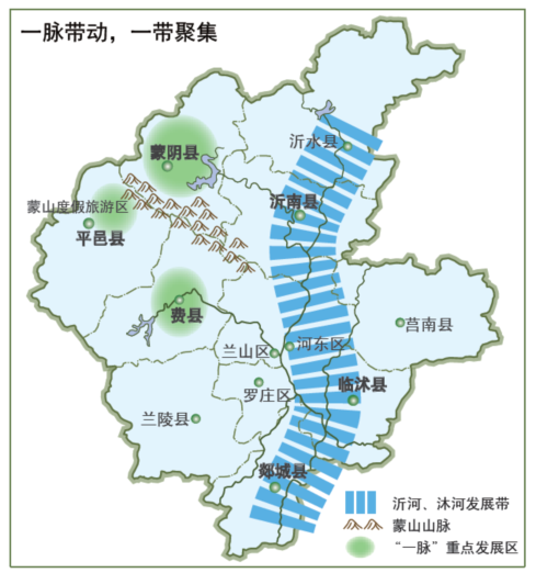 即以沂河、沭河两岸为发展带,包括沂南县、临沭县、郯城县,发挥沿沂沭河生态走廊的河湖、湿地养生资源和生态农业优势,打造以康养旅游、体育健身、健康农业为重点的健康产业集聚带,培育新的经济增长点。